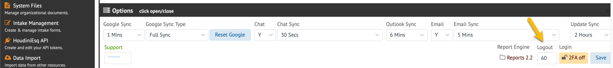 HoudiniEsq will automatically log you out of the program if you are idle for too long. You can set your preferred timeout period under Config-Administrator-Logout. See the image capture below. If you make a change don’t forget to click the Save button.